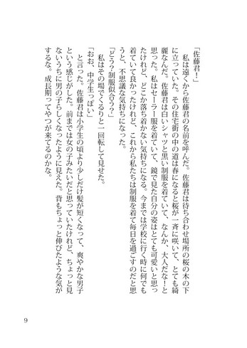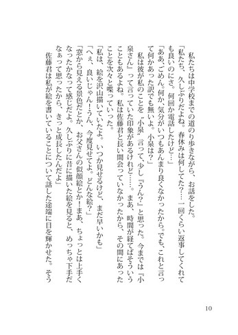 「私は佐藤君の匂いのするベッドに横たわり、幾らか迷って太ももに決める。太ももの上のほう。スカートを捲って肌を彼の前に晒す。学校ジャージの短パンを履いているから下着は見られないものの、なんだかえっちな行為をするみたいで、顔が熱くなってしまう。彼は私の太ももにあまり躊躇もなく噛みついた。皮膚が上顎と下顎で挟まれて、まず八重歯が皮に食い込んでいく。滲み出る血液は表面張力で彼の歯茎を登っていき、唾液と混じり合う。噛まれた皮膚周辺がピクピクと微小な痙攣を起こしズクズクと痛みを感じた。傷からじわわと出血が起こると『これは私の身体なんだ』という当然の事が改めて認識され、次いで『私ってなんだろう』といった事に関心が向くようになる。」